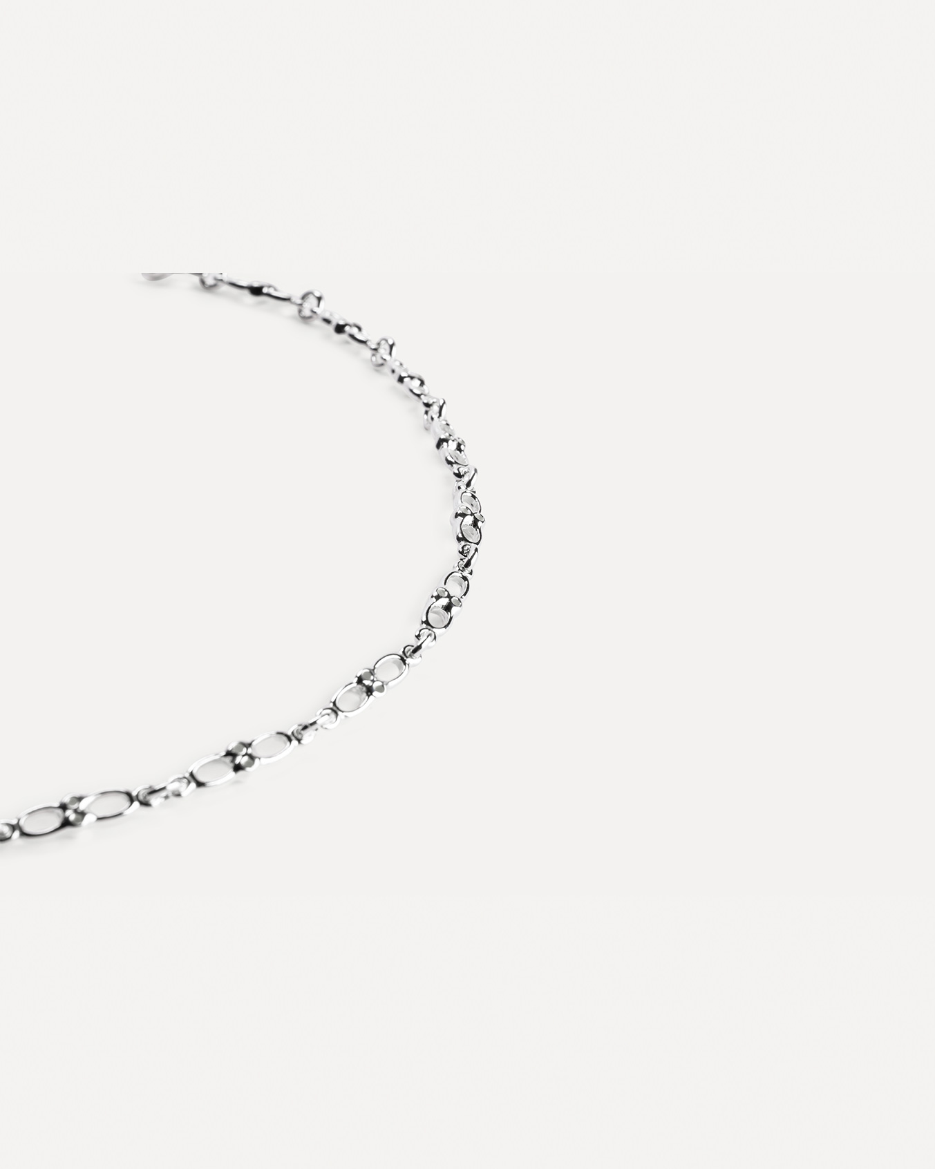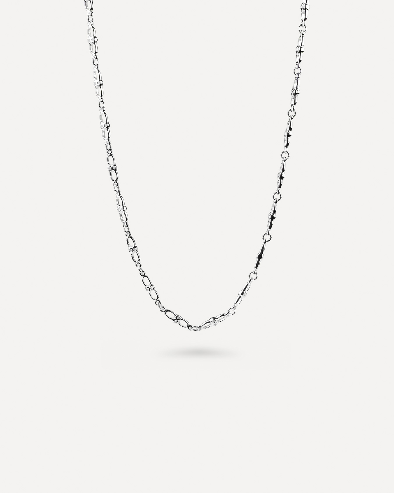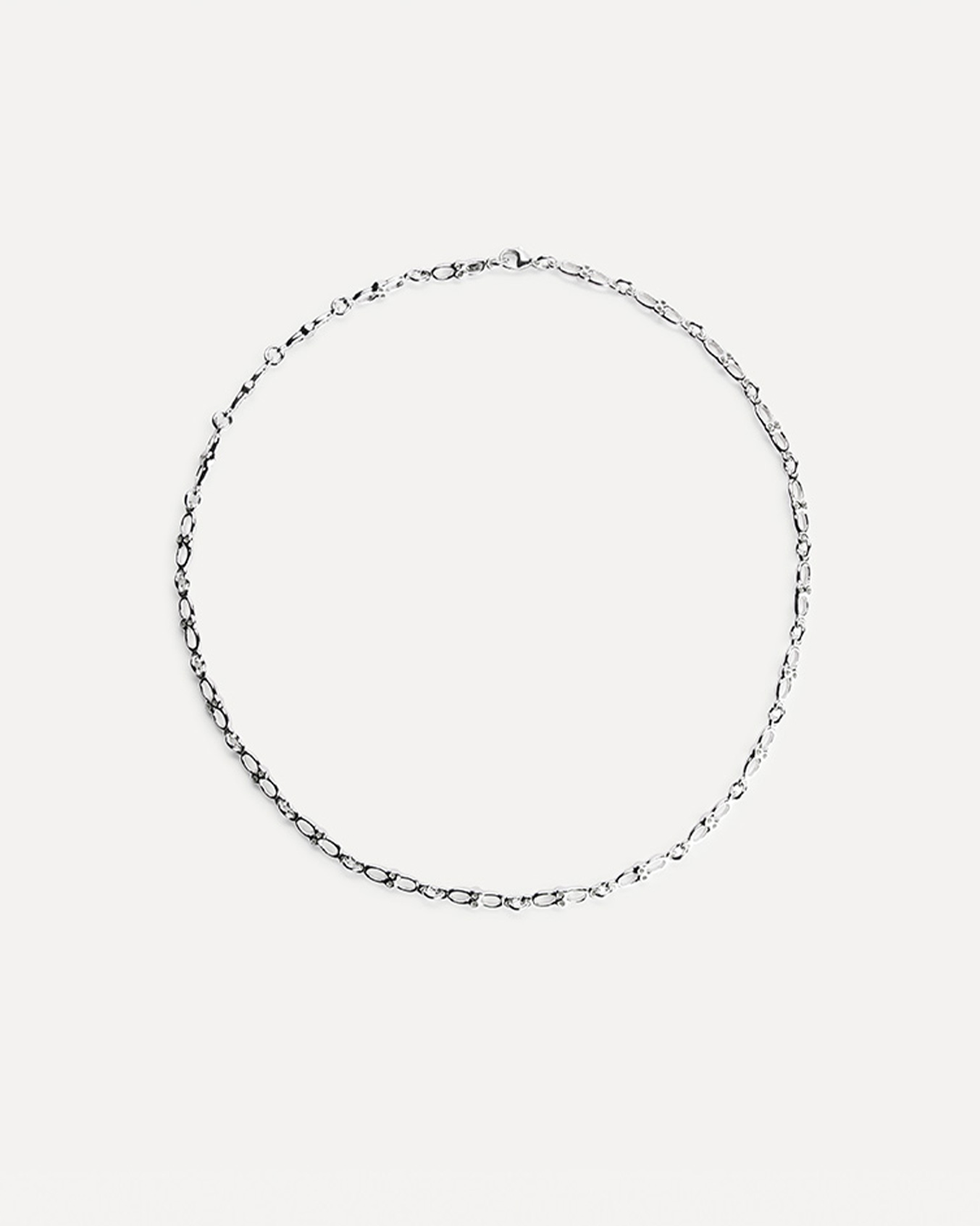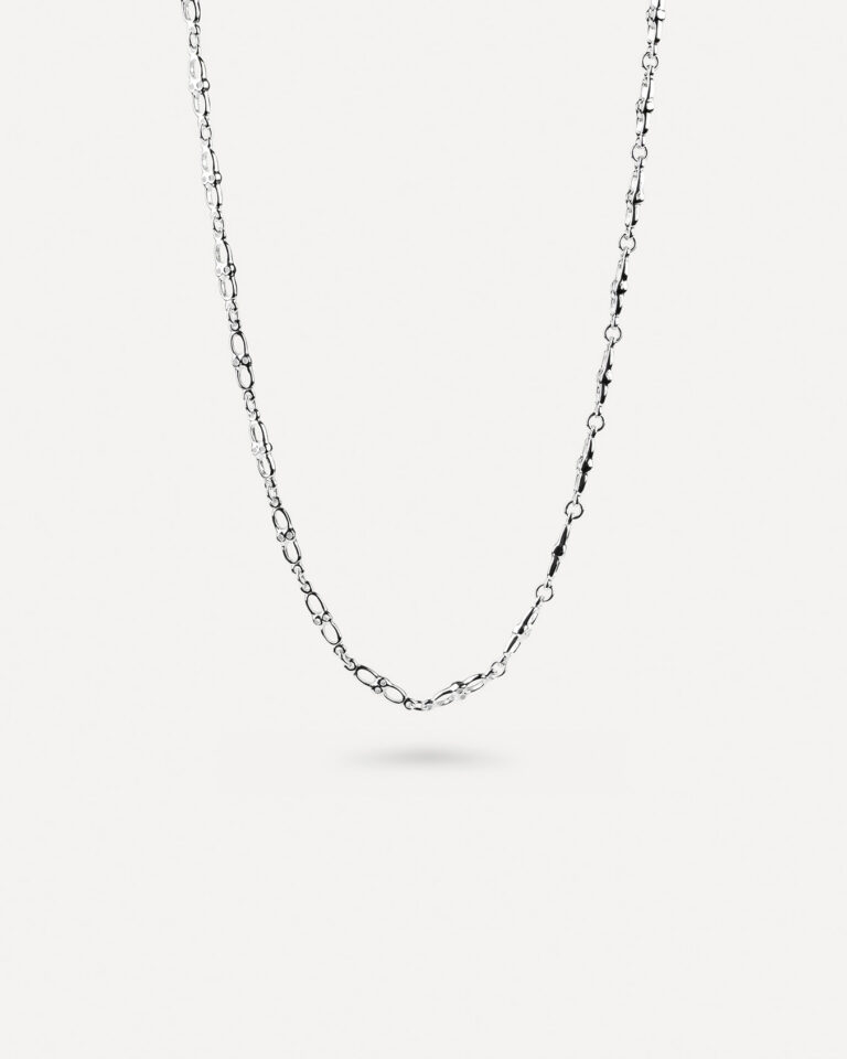 Et lett gjennomhullet leddet kjede. Fint om det ligger tett opp mot halsen men også fint i en lengre variant-eller begge deler samtidig.Fullfør uttrykket med passende armbånd for et harmonisk og gjennomført sett.