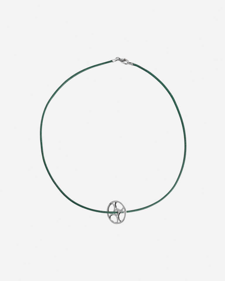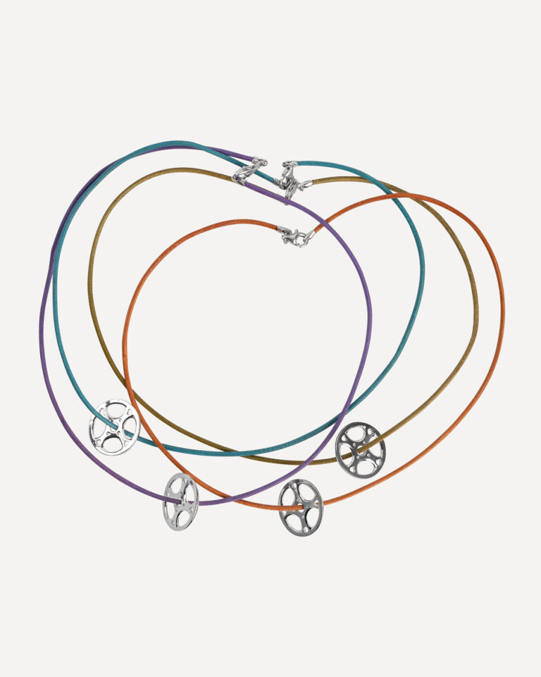 Uten oppheng men kun som en enkel skive har vi her gått tilbake til den sannsynlig opprinnelige utførelsen. Kjedet er i dette tilfelle en lær snor som kun er tredd igjennom selve skiven. Finnes i mange farger lær snor.
