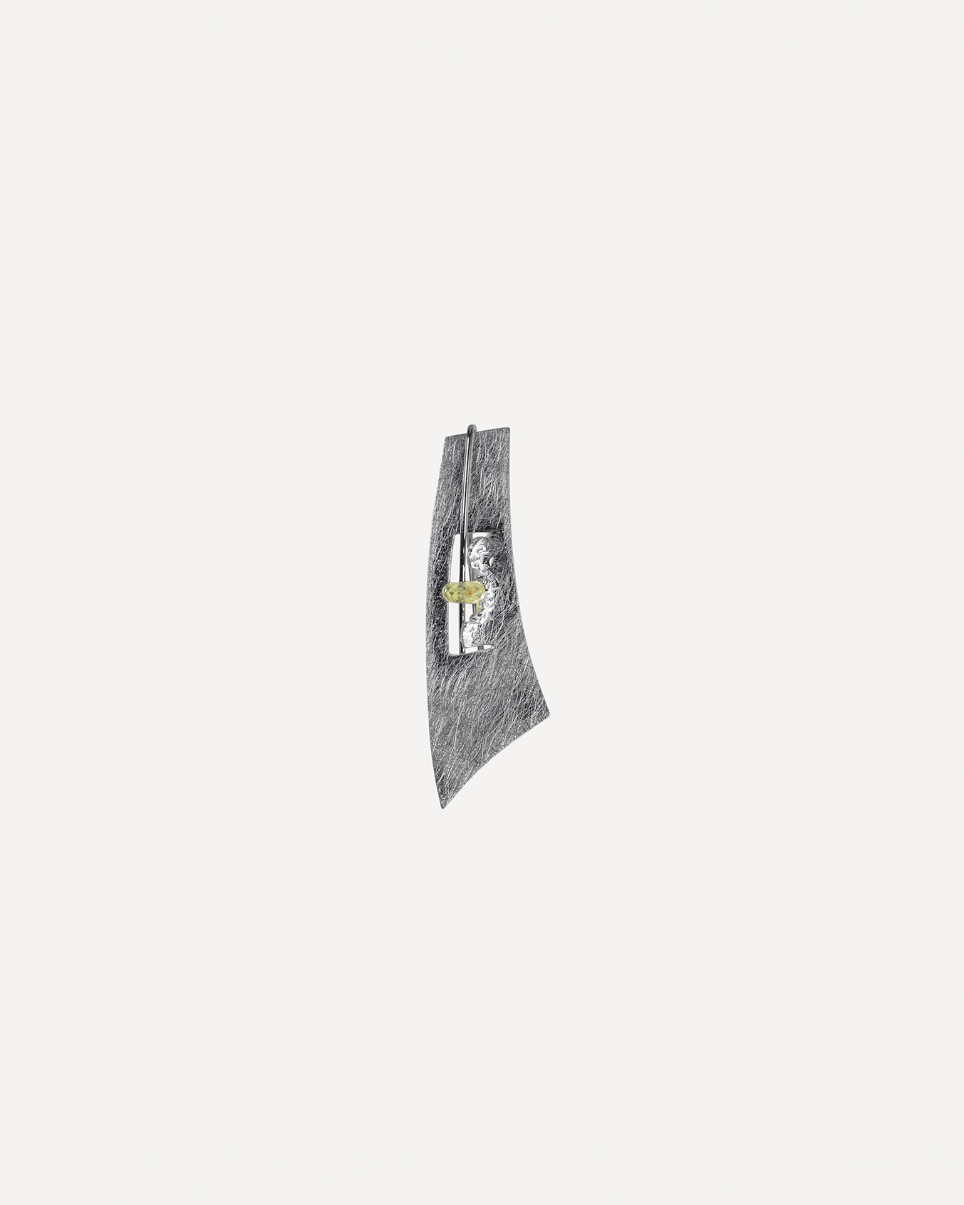Den minste av de tre brosjene – lett, stram og presis i formen. Kan brukes alene for et diskret, men karakterfullt uttrykk, eller kombineres med sine søstre i serien. Den kan festes både vannrett og loddrett – med fri plassering og uten bestemt retning. Steinen er tredd på en ståltråd som også fungerer som nål. Et lite smykke med stor personlighet.