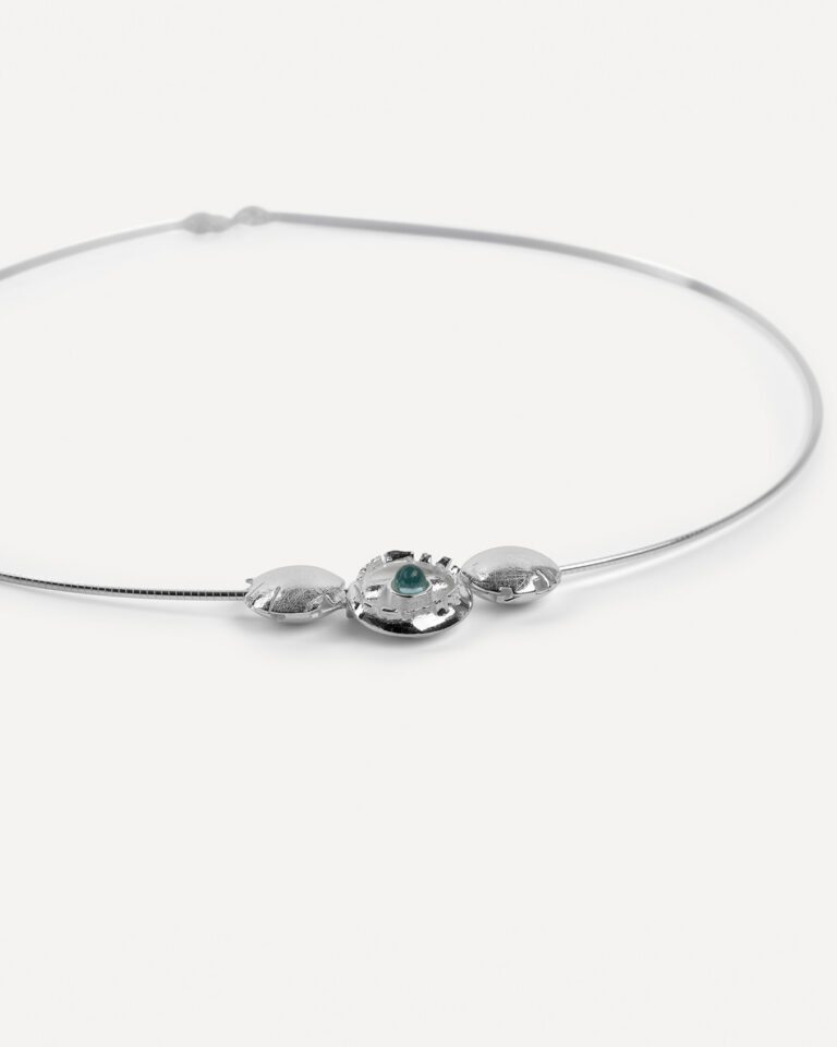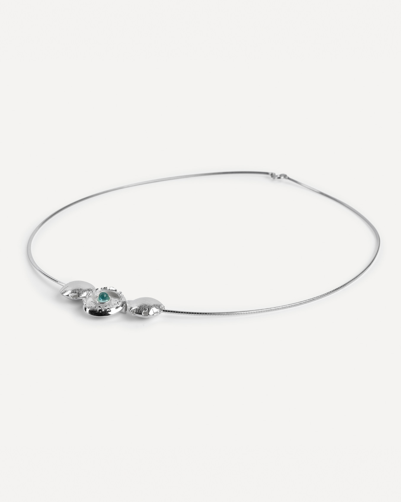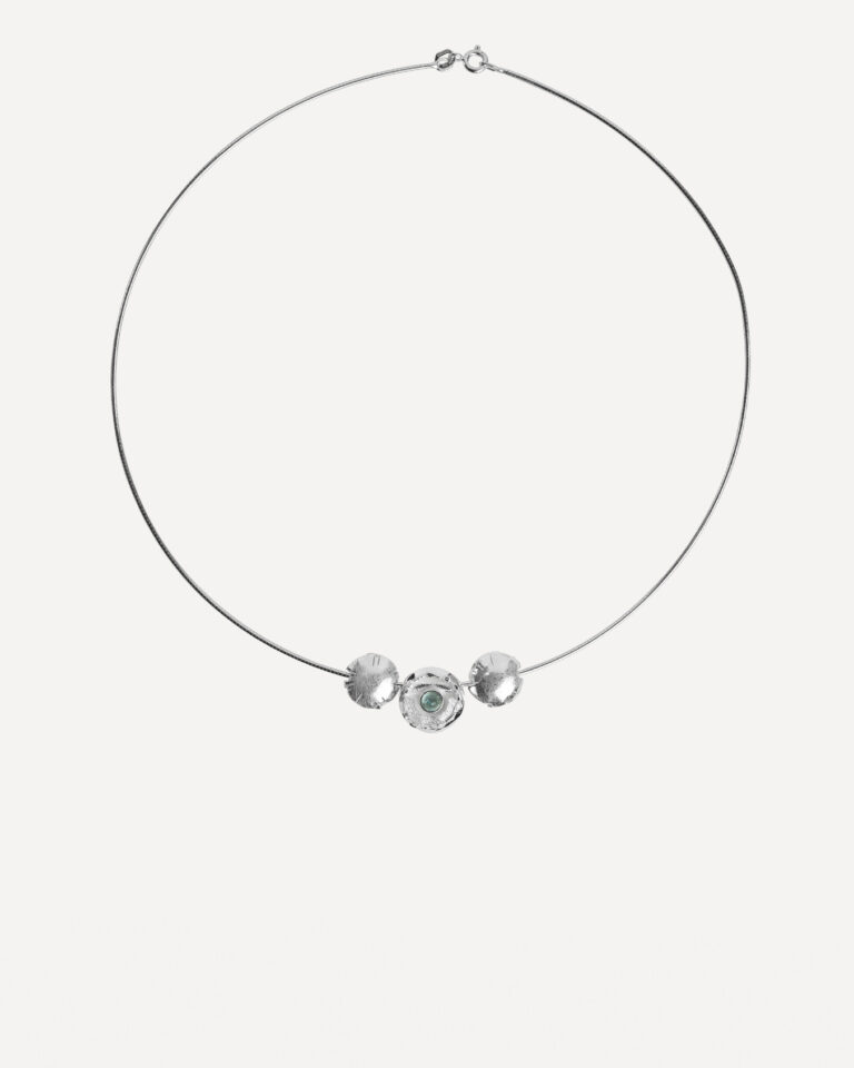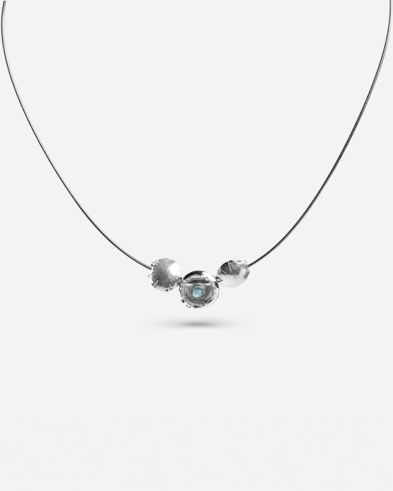 Et nett og feminint smykke med tre små, linseformede elementer – der den midterste er prydet med en liten stein. Smykket henger i et bevegelig kjede som legger seg mykt rundt halsen. Et lett og balansert smykke med et presist formspråk og diskret eleganse.