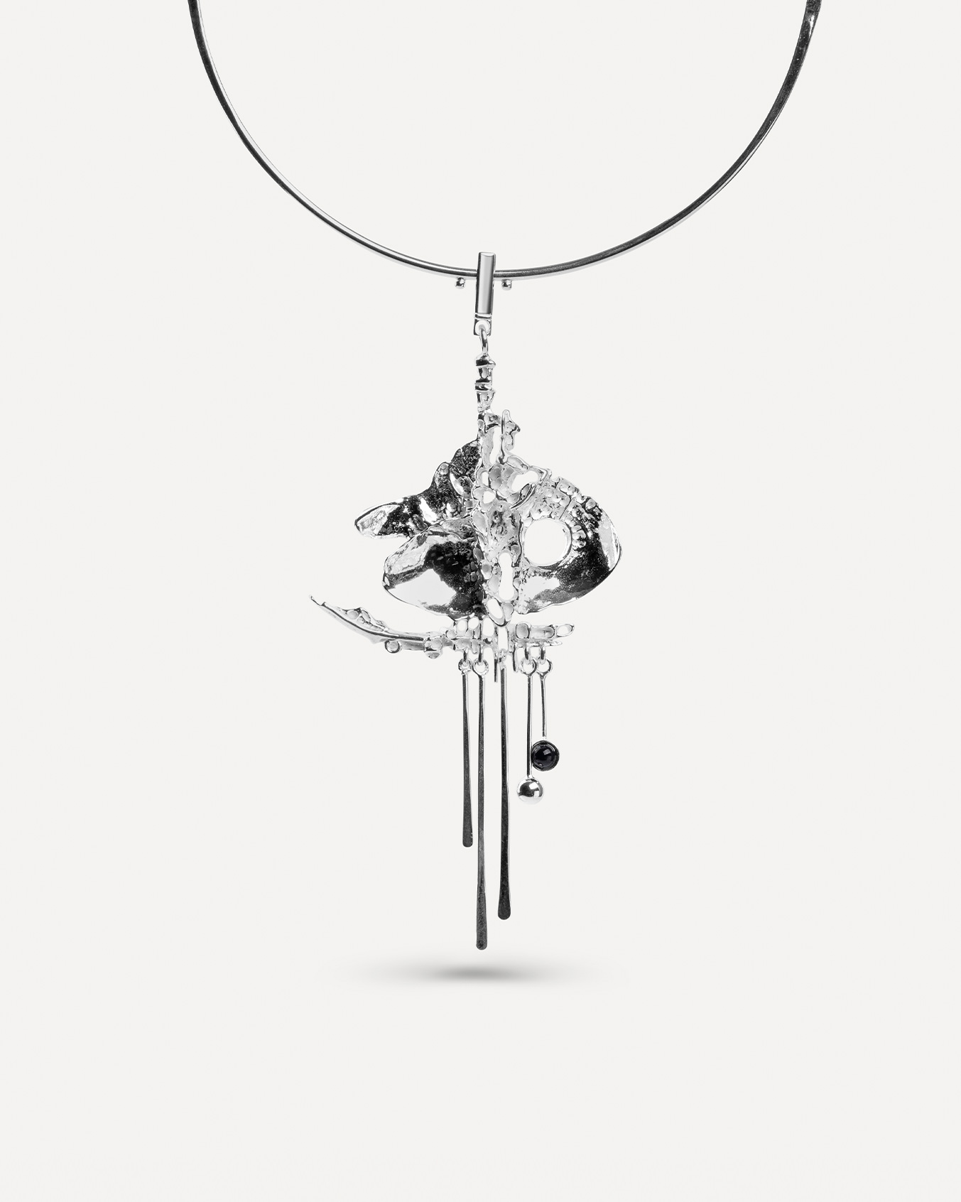 A striking, substantial necklace with a delicate, neck ring, and hanging rods. Strong contrasts define the piece, combining polished silver with the characteristic white silver that distinguishes the Tundra collection. Elegant with formal attire, yet equally bold and casual when worn with jeans and a sweater.