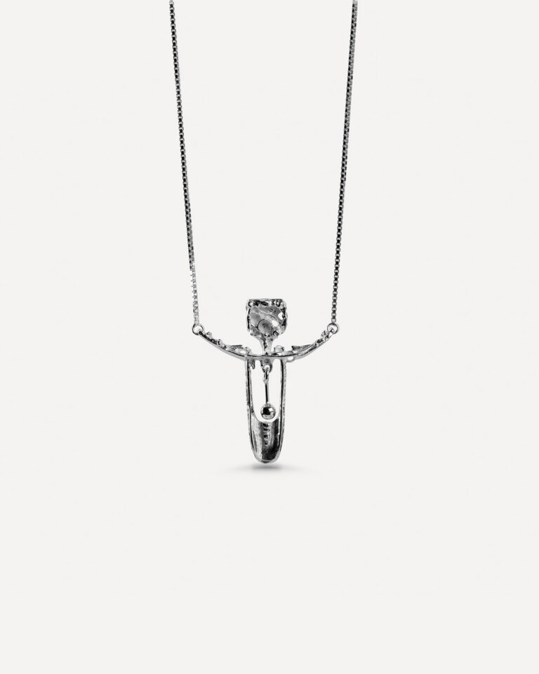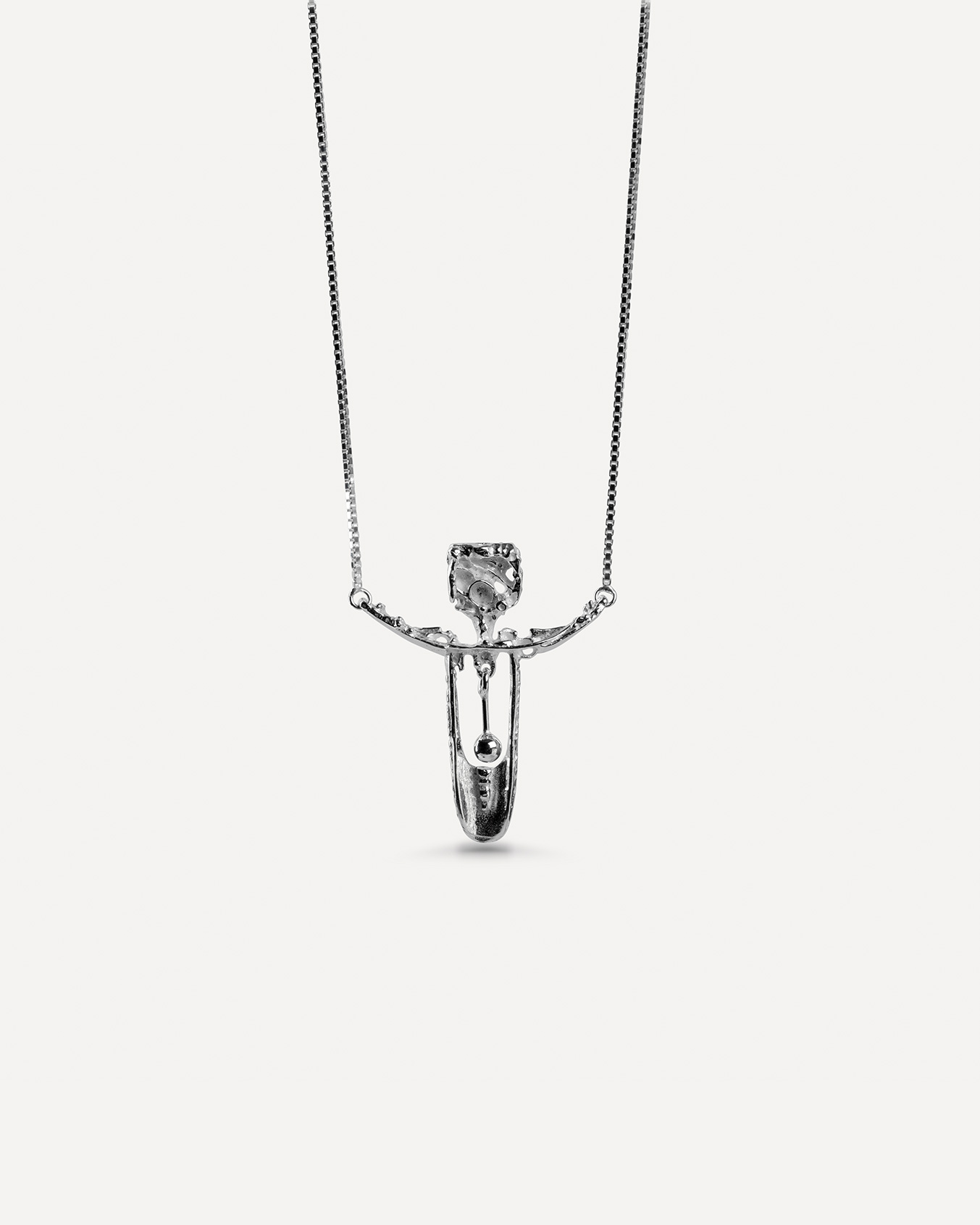 Et sirlig og balansert smykke som kommer best til sin rett når det bæres nært halsen. I midten henger en bevegelig stav med en liten kule – et diskret, men iøynefallende blikkfang.