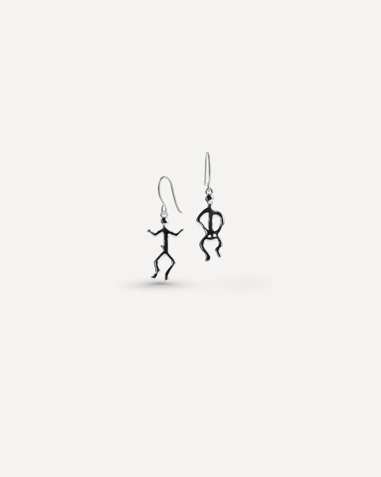 Ørepynt med motiv av dansende par – gjenskapt fra en 6–7000 år gammel helleristning funnet i Jiepmaluokta (Hjemmeluft), Alta. Et livfullt og sjeldent motiv fra forhistorisk tid, som gir et glimt av menneskelig nærhet og bevegelse i bergkunsten.