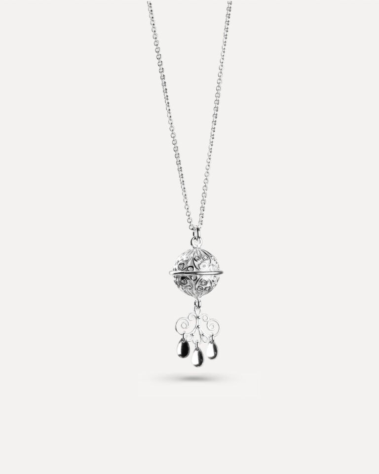 Komsekule med fint filigrans arbeide, med et hengende filigran løv – inspirert av tradisjonellt bunadsølv.