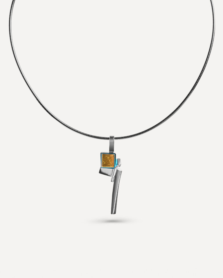 Et sterkt arkitektonisk halssmykke med stramme linjer og et klart uttrykk. Anhenget bæres i et bevegelig kjede som legger seg naturlig rundt halsen. Smykket løftes av en mosaikkstein – laget av glass med innsmeltet bladgull.